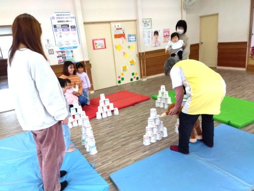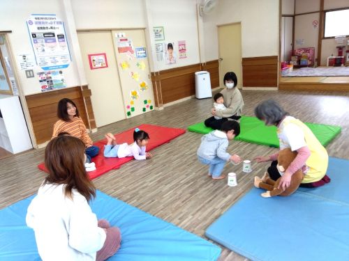 ・ちびすけどっこい~🎵、耳に心地よいわらべうたを歌いながら、親子で一緒に遊びませんか?長縄や、身近なおもちゃも使って、ママとふれあって遊んでいます(^^♪ お近くの人は気軽にのぞいてみてくださいね♡