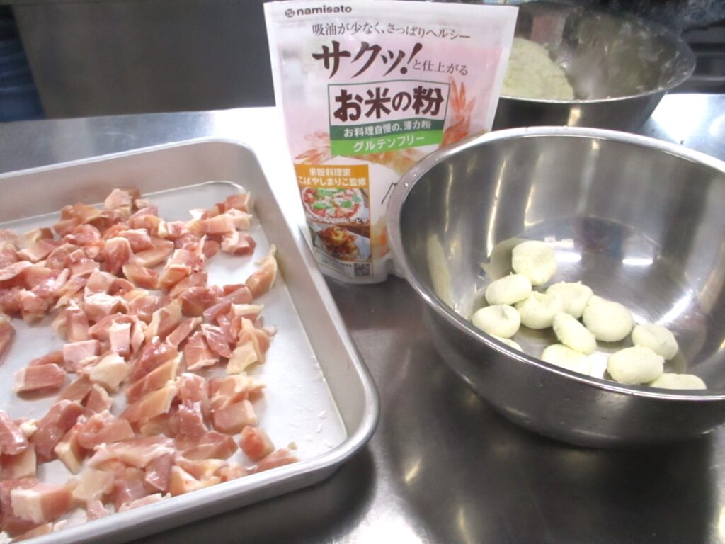 ②米粉と上新粉合わせて100gと木綿豆腐100gを一緒によくこねて、①の汁が煮立ったら、団子状にして加え、団子が浮いてきたら出来上がり。