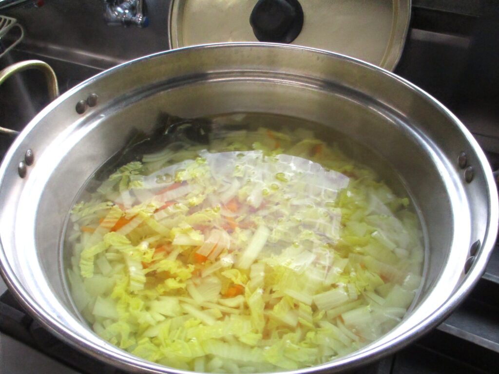 ①好きなお野菜を煮る。煮えたら鶏もも肉を小さく切って加え、煮る。