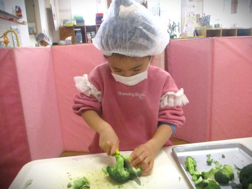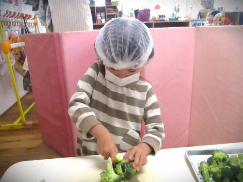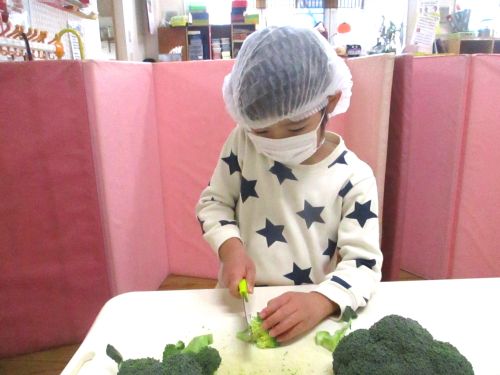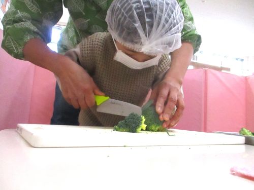 ・やりたいおともだちで、ブロッコリーを切りました。包丁を持つ手に力がうまく伝わってきて、どんどん上手になっています(^^♪