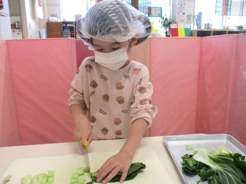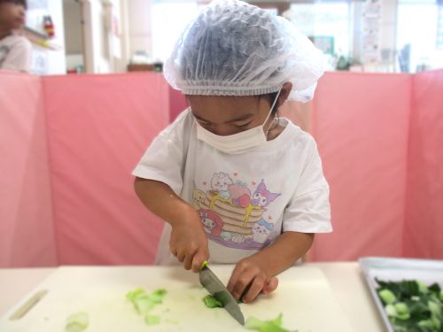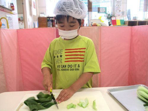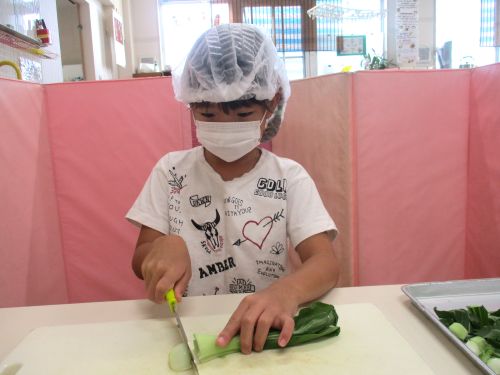 ・調理体験を希望した年長児がチンゲン菜を切りました。子どもたちの手つきが回を重ねることに良くなってきているので嬉しいです(^^♪