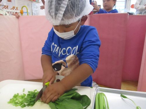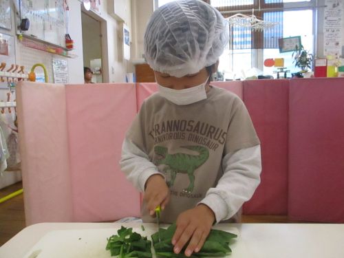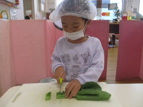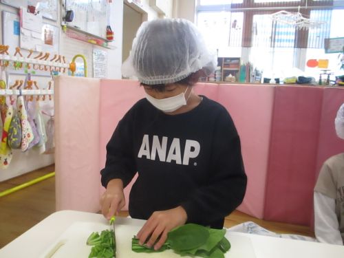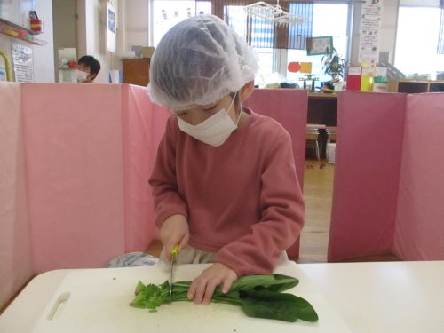 今日は、すまし汁に入る「ほうれん草」を切りました。