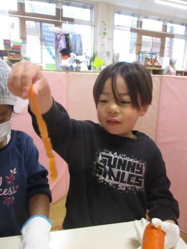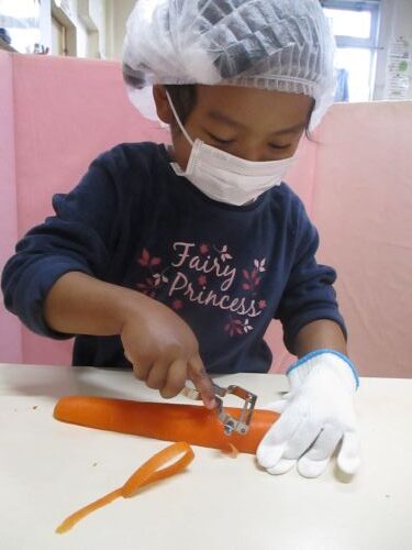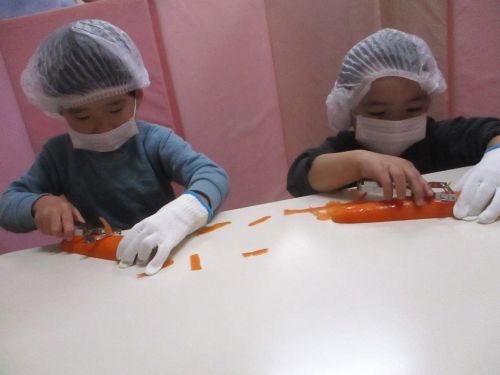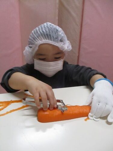 給食の「にんじんとみかんのサラダ」のにんじんをピーラーでひらひらにしました。