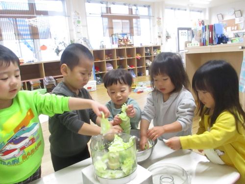 まずは、たんぽぽ組とちゅうりっぷ組の希望者で、白菜とキャベツをちぎり、