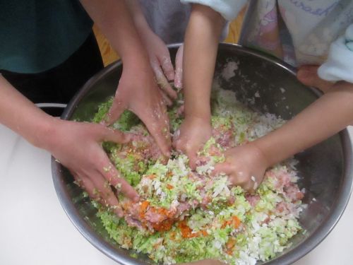 さくら組が餃子のタネをこねました。