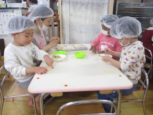 れんげ組、ひまわり組、さくら組で、餃子を成形!