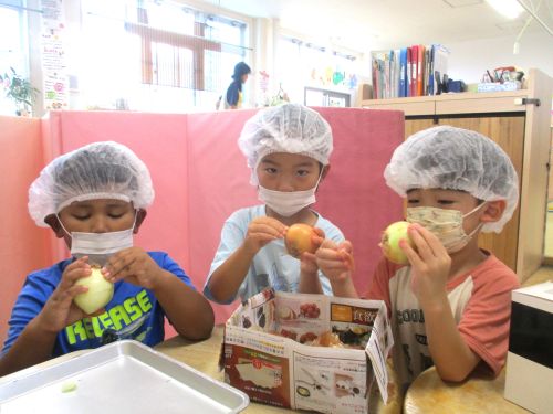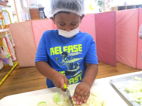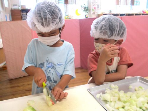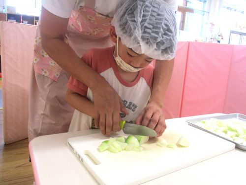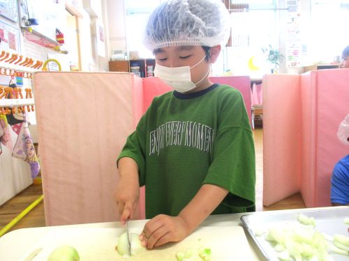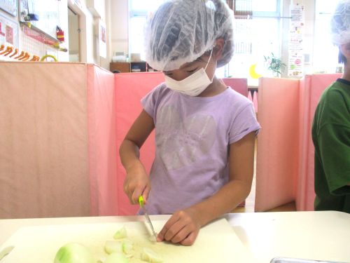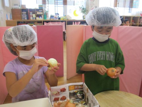 年長児の希望したお友だちが、玉ねぎの皮むき、包丁で切る体験を行いました(^^♪